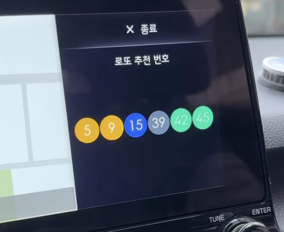 그러면, 잠시 후 당신의 차는 "지금 불러줄게요" 라는 대답과 함께, 내비게이션 화면에 여섯 개의 행운의 숫자를 띄워줍니다. 한 유튜브 영상에서는, 실제로 한 운전자가 이 기능을 사용하자 그의 차가 '5, 9, 15, 39, 42, 45' 라는 여섯 개의 숫자를 추천해 주는 모습이 나오기도 했습니다.