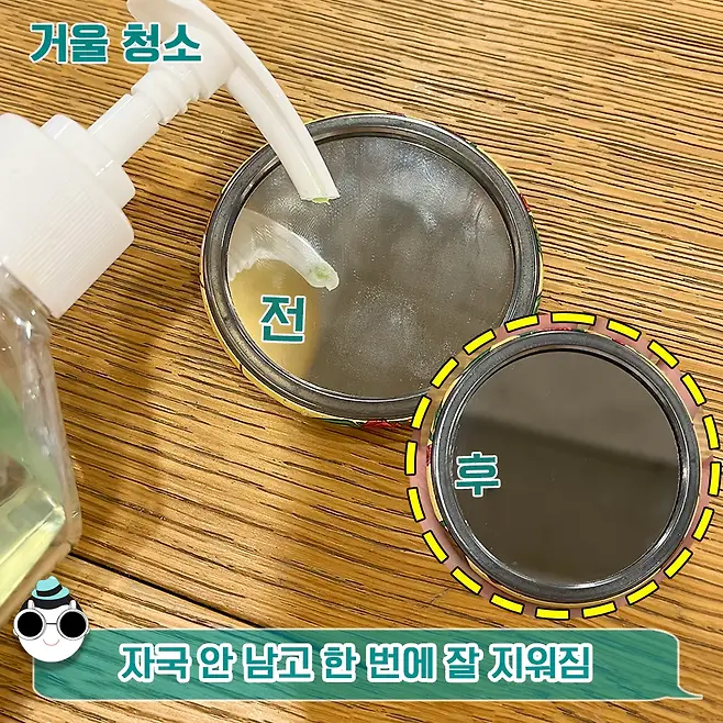 그래서 2~3번 정도 더 닦아주는데 손소독제로 거울을 닦아주면 자국도 안 남고 한 번에 잘 지워져서 거울 청소하기에 안성맞춤입니다.