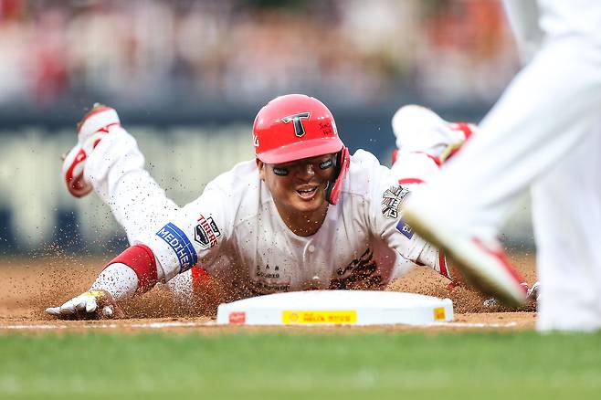 김서현은 꿈쩍도 하지 않은 김태군을 상대로 이후 연달아 슬라이더를 던졌지만, 이마저도 뜻대로 존에 들어가지 않았다. 결국 김태군은 허벅지에 공을 맞고 걸어나갔다.