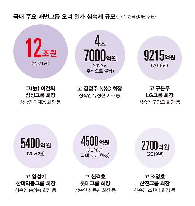 이 밖에 고 이건희 선대회장 사후 삼성전자 오너 일가는 12조원에 이르는 상속세를 신고했다. 천문학적 규모의 상속세를 납부하기 위해 상속받은 주식을 팔고 있을 정도다. 고 김정주 넥슨 창업자 가족은 약 6조원의 상속세를 낼 수 없어 정부에 넥슨 지주회사 NXC 지분을 물납한 상태다. 이에 정부가 넥슨의 2대 주주로 등극하는 웃지 못할 일이 벌어졌다.