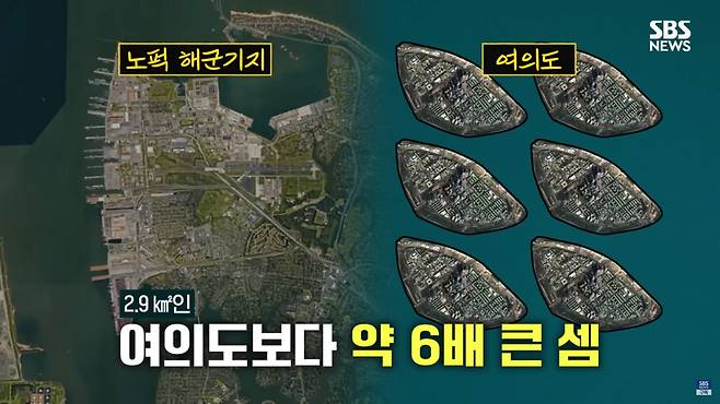A. 미국 버지니아 주 남동부 해안 쪽에 있는 'Naval Station Norfolk'이 정식 명칭이고요. 보통 '노퍽 해군기지'라고 부르는데 미국뿐 아니라 전 세계에서 가장 큰 해군 기지입니다. 17.4km² 정도 됩니다. 2.9km²인 여의도보다 약 6배 큰, 어마어마한 크기죠.
