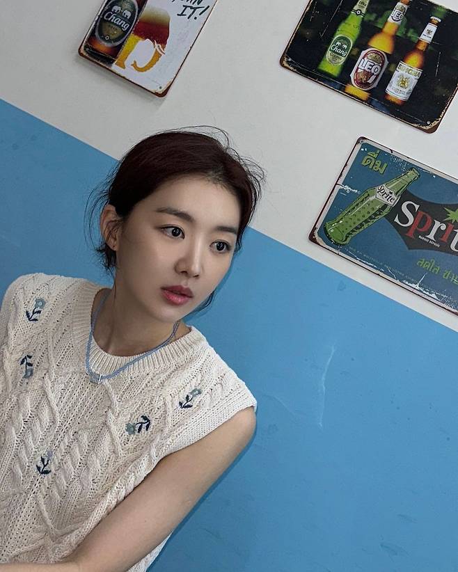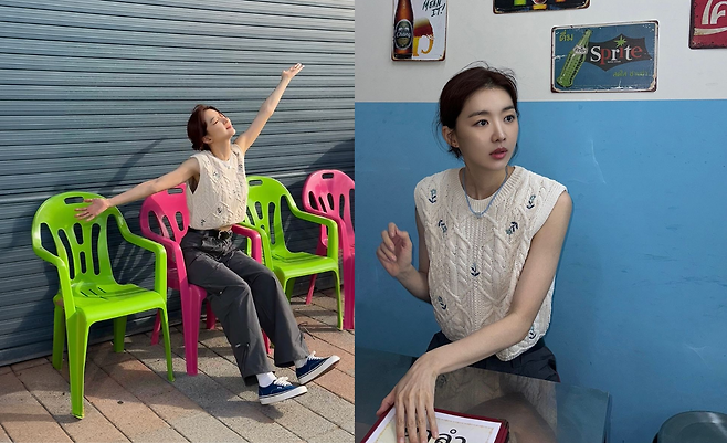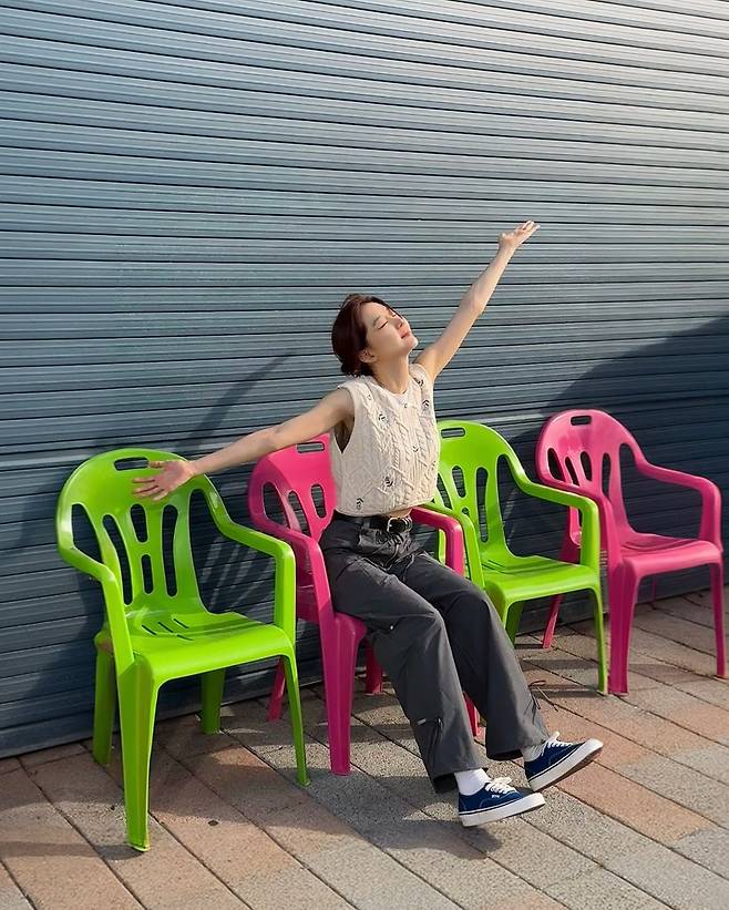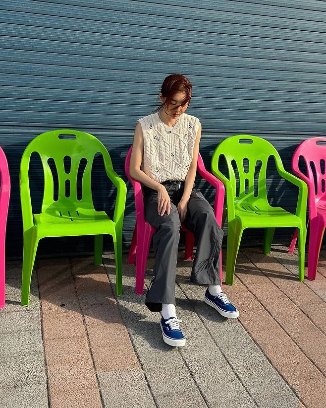 사진 속 장희진은 자수가 있는 아이보리 꽈배기 니트 베스트와 카키색 팬츠를 입고 운동화를 신어 캐주얼한룩을 선보였다.
