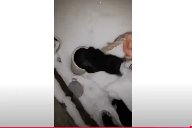 구조된 고양이는 까만 털을 가진 새끼 고양이였습니다. 땅에 내려오자마자 눈밭을 빠르게 달려갔습니다.