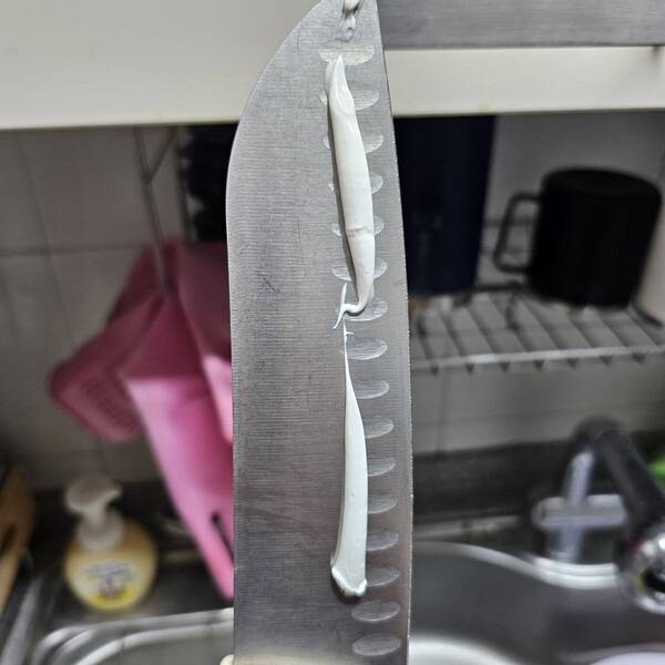 수세미에 치약을 조금 짜서 칼날을 따라 문질러보세요. 금방 거뭇했던 칼이 은색 광택을 되찾습니다.