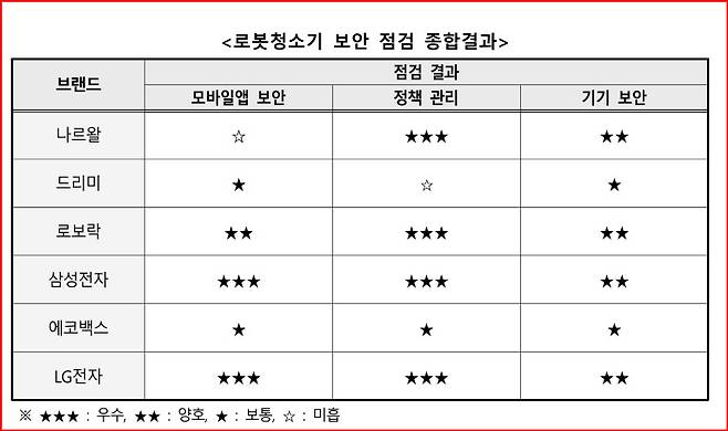 반면 삼성전자와 LG전자 제품은 접근 권한 설정, 불법 조작 방지 기능, 안전한 패스워드 정책, 업데이트 체계 등이 상대적으로 잘 마련돼 종합 평가에서 우수한 성적을 받았다.