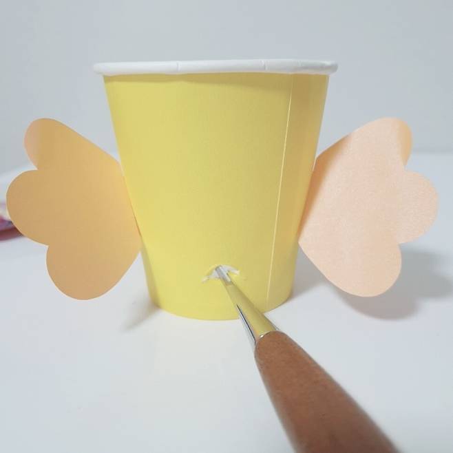 그다음 뾰족한 볼펜이나 송곳으로 종이컵 뒤쪽 하단에 구멍을 뚫어주세요. 빨대가 끼워질 만큼 크기를 뚫어주시면 된답니다.