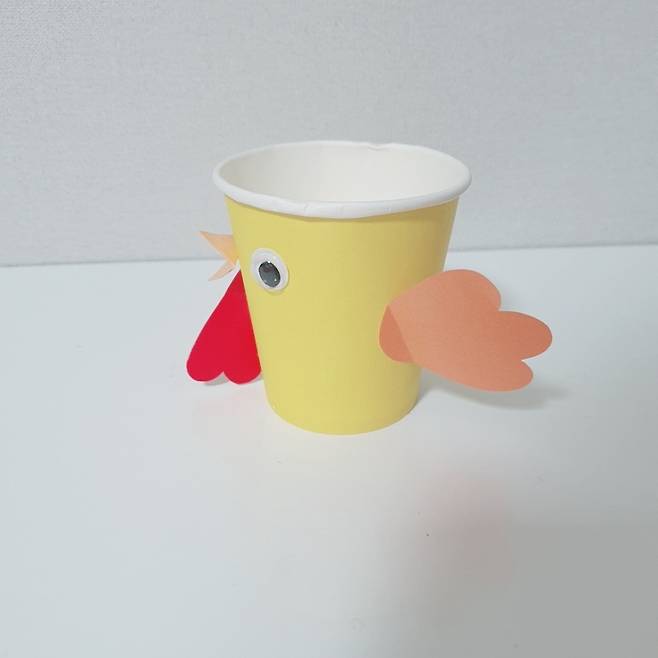 먼저 종이컵을 바르게 세우고 닭의 날개와 눈, 부리, 아랫볏을 만들어 붙여주세요. 저는 아이와 색종이로 잘라 붙여주었답니다. 옆에서 보는 구도로 붙여주셔야 예뻐요!