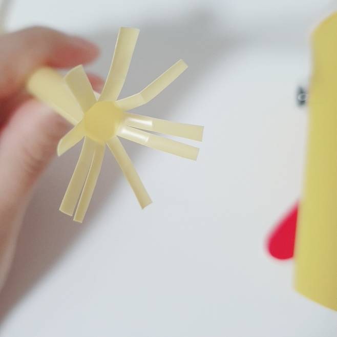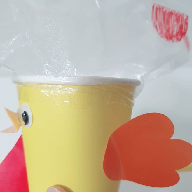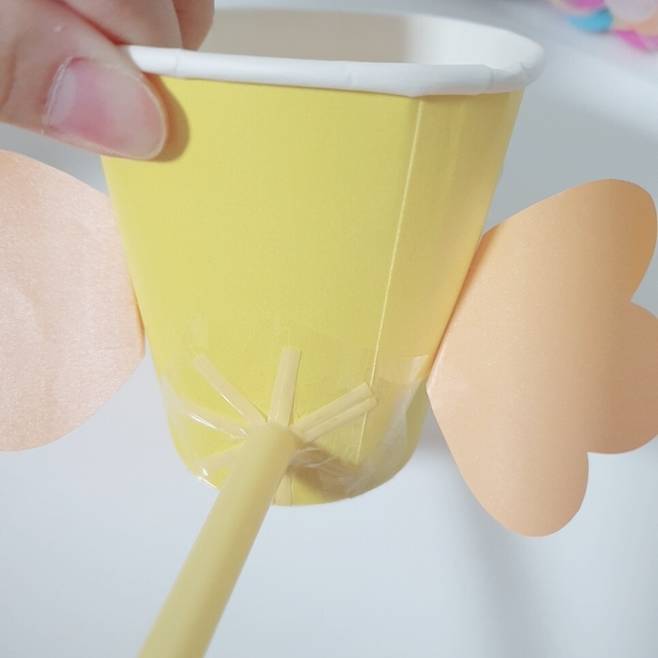 그리고 구멍이 있는 쪽에 테이프로 붙여주시면 된답니다. 빨대를 불어서 공기가 종이컵 안으로 들어가야해요!