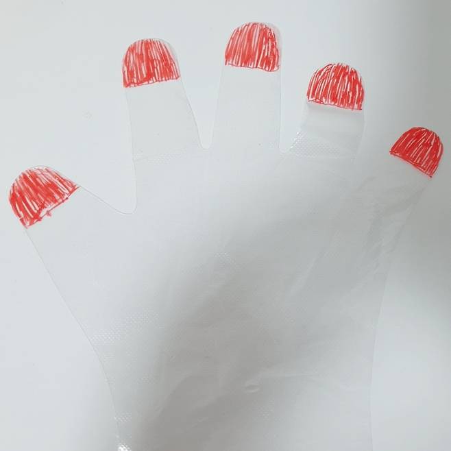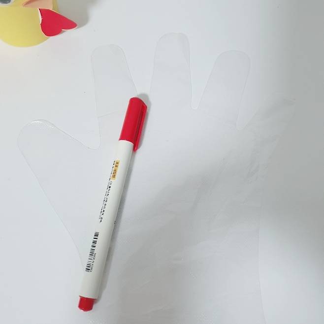 이제 일회용 비닐 장갑을 준비해주세요. 이제 이 비닐 장갑이 닭 머리 위에 있는 볏이 될거랍니다.