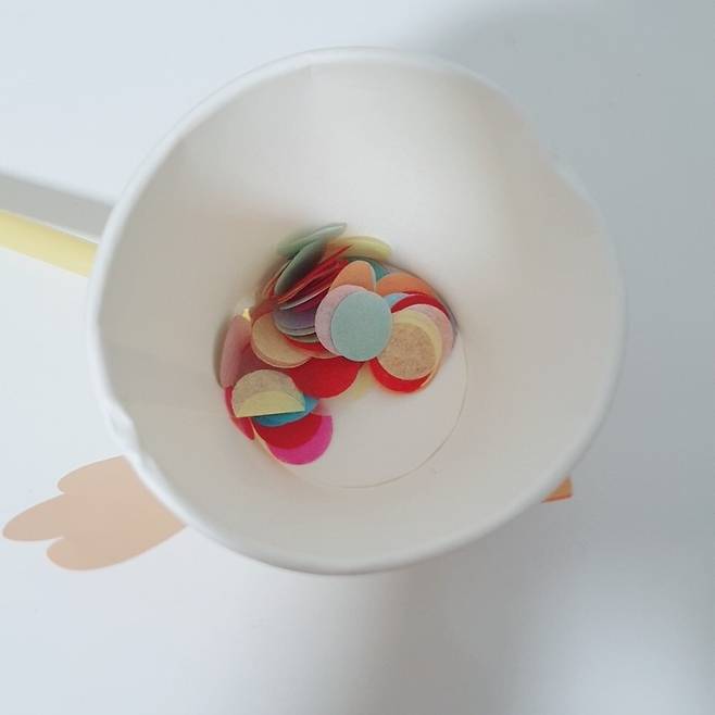 그다음 종이컵 안에 종이 꽃가루를 넣어주세요. 저는 다이소에 있는 이벤트 풍선 안에 있는 종이 꽃가루를 빼서 사용했어요.