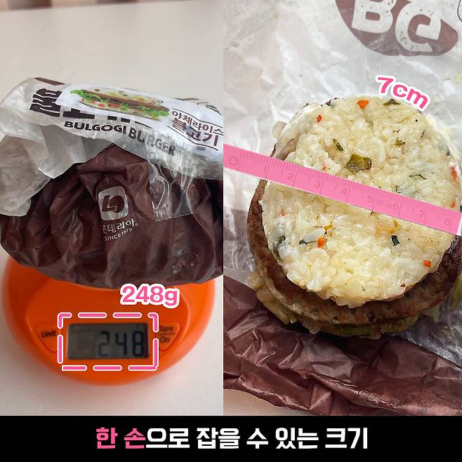 무게는 248g 나왔어요. 요 정도면 일반 버거랑 비슷한 무게인 것 같아요. 밥 때문에 무게가 가볍지는 않아서 만족~