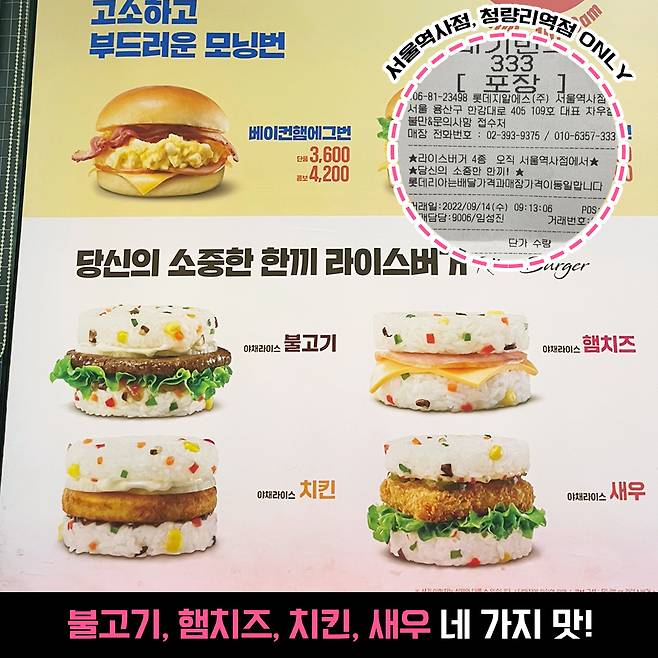 하지만 이번에도 수많은 마니아층의 원성을 이기지 못하고 돌아온 라이스버거. 다만, 조금 특별하게 돌아왔다는데요?! 서울역사점과 청량리역점에서만 판매하고 있어요. 이 두 매장 이후 부산비프광장점에서도 재출시되었다고 하네요.