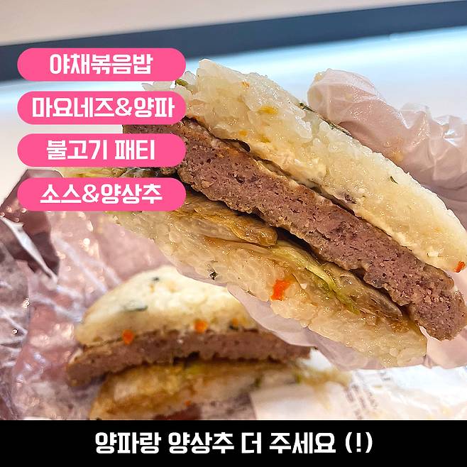 전체적으로 밥과 다 잘 어울리는 재료들이라 좋았지만, 밥이랑 고기 패티에 비해 야채와 소스가 상대적으로 적은 느낌이었어요.(ㅠㅠ) 특히 양파는 거의 없는 수준..