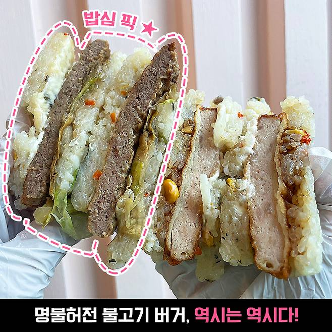 직접 재보니 불고기 패티만 10cm 정도 나왔어요. 7cm인 밥에 비하면 엄청 큰 크기죠? 요 부분은 넘나 만족♥