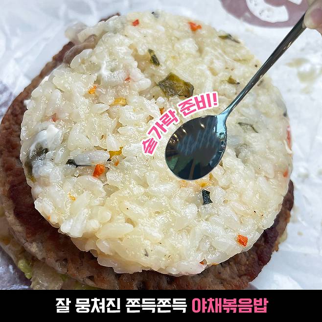 전체적으로 밥과 다 잘 어울리는 재료들이라 좋았지만, 밥이랑 고기 패티에 비해 야채와 소스가 상대적으로 적은 느낌이었어요.(ㅠㅠ) 특히 양파는 거의 없는 수준..