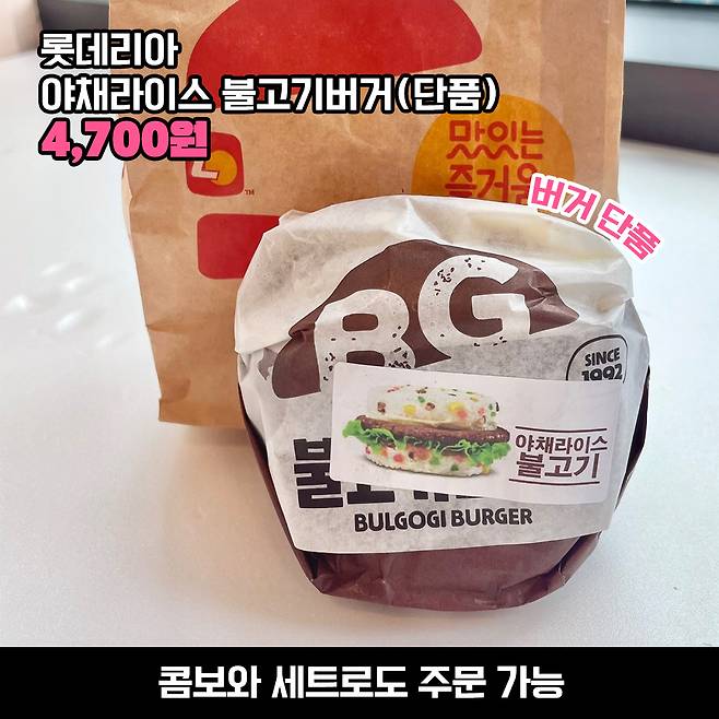 단품은 4,700원이고, 1,000원 추가하면 음료 콤비, 2,000원 추가하면 감튀 세트로도 먹을 수 있어요.