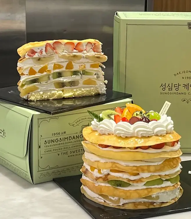내놓는 케이크마다 이렇게 핫할 수 있을까. 이번 성심당의 신상 케이크는 시루 대신 크레페다. 5종의 과일과 성심당 생크림을 켜켜이 쌓아 올려 만든 크레페 케이크. 맛이 없을 수 없는 조합이다. 성심당 롯데점 1층 케이크부띠끄에서 구매할 수 있고 오전 10시부터 대기표를 배부한다. 가격은 4만 5,000원.