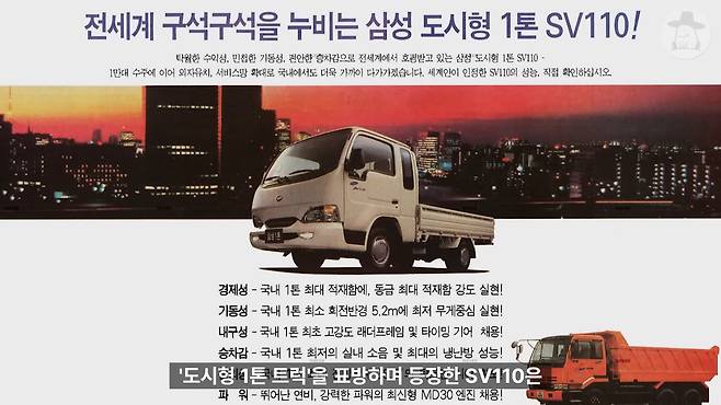 아시는 분들도 있겠지만 삼성그룹은 삼성승용차 'SM 세단' 시리즈에 앞서 상용차 부문에 먼저 진출했습니다. 기술 제휴선이었던 닛산의 상용 라인업을 들여와 대형 트럭 SM 시리즈를 출시한 이후 1998년 소형 트럭 '아틀라스'에 기반한 1톤 트럭 SV110을 출시한 것이죠.