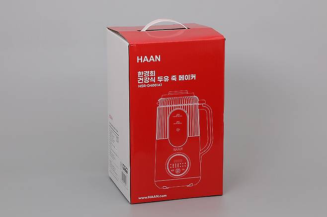 한경희 두유제조기 HSR-D4001A1은 붉은색과 흰색으로 된 박스에 담겨 있다. 박스 앞면에는 제품 이미지가 라인아트로 인쇄되어 있어서 대략의 디자인을 가늠하는 데 도움이 된다.