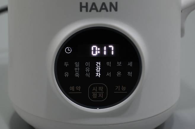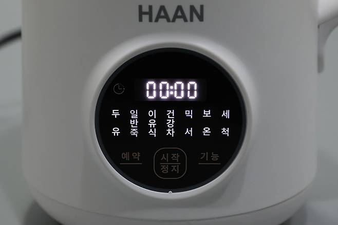 기능 버튼을 누를 때마다 조리 메뉴가 두유, 일반죽, 이유식, 건강차 등의 순서로 바뀌는데, 각 메뉴의 조리 시간은 최적화된 시간으로 자동 설정된다. 두유와 일반죽은 30분, 이유식은 35분, 건강차는 17분이며, 믹서 기능은 3분, 세척 기능은 12분으로 설정된다.