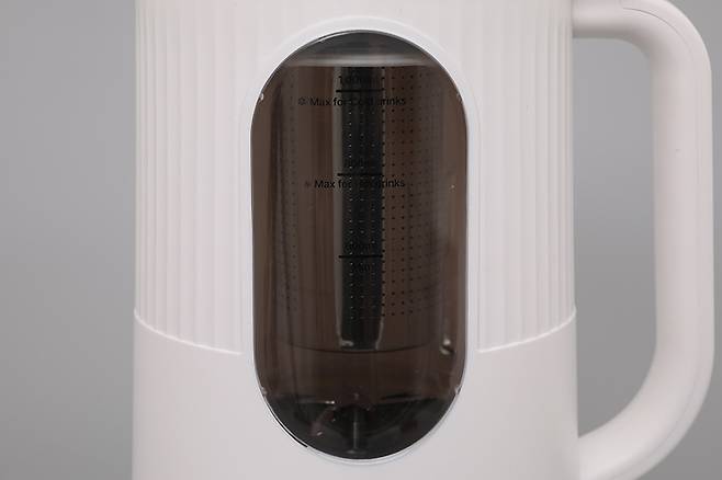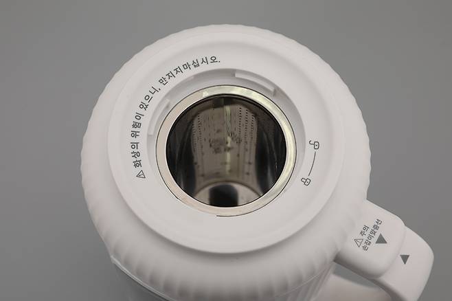본체에 있는 투명창에는 내부 용기의 눈금자가 표시되어 있으며, 찬 음료와 따뜻한 음료의 상한선도 표시되어 있다.