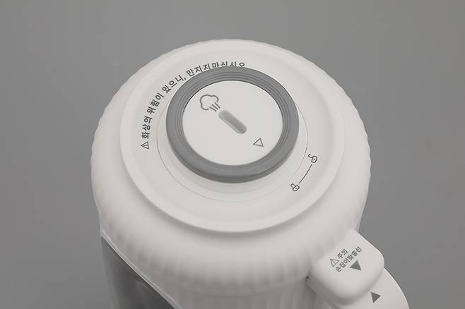 한경희 두유제조기 HSR-D4001A1의 본체 윗면은 뚜껑이 씌워져 있으며, 뚜껑 가운데에는 스팀홈이 나 있는 스팀캡이 하나 더 씌워져 있다.