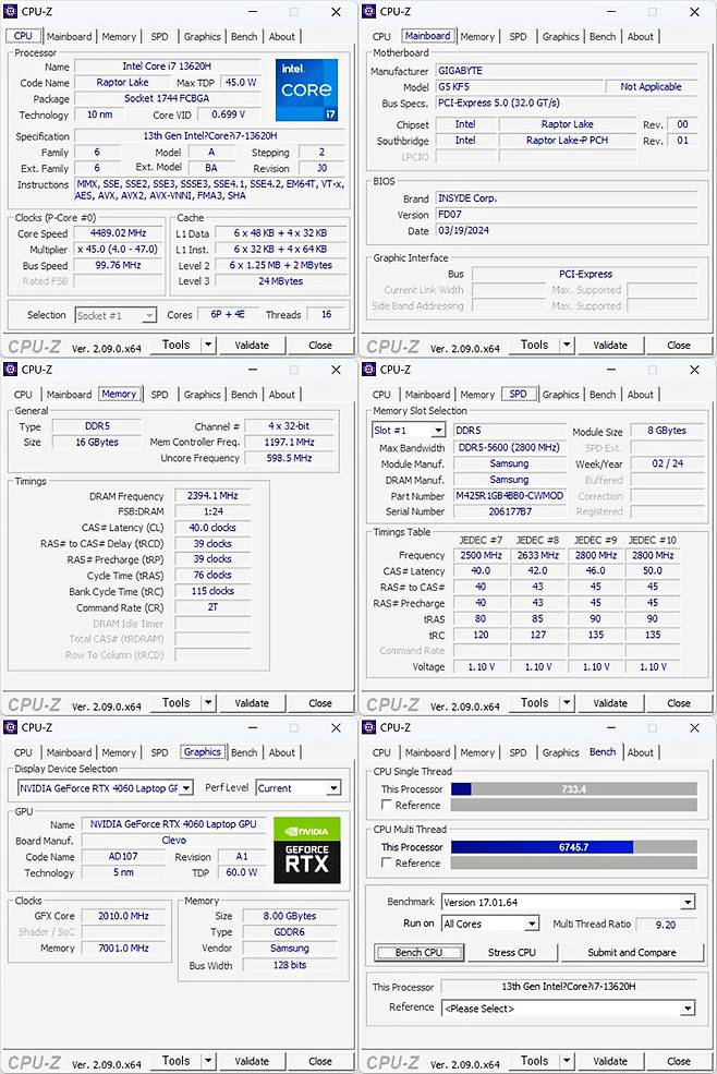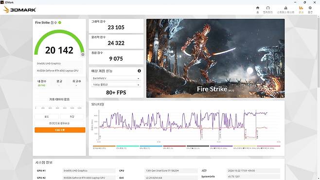 CPU는 인텔 i7-13620H(10코어 16쓰레드), GPU RTX 4060의 조합으로 간단한 게임 및 그래픽 작업에 용이하고 NVIDIA AI 기술 및 Microsoft Copilot 기능 지원으로 다양한 작업에 활용을 할 수 있습니다. 위는 대표적인 벤치마크 툴인 3D MARK 와 PC MARK, 시네벤치의 결과 값입니다. 타임스파이 8,502점, 파이어스트라이크 20,142점, PCMARK 5,507점, 시네벤치 멀티 11,691점 싱글 1,699점으로 측정되었습니다.