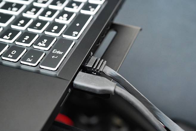 노트북 포트는 좌측에 USB 3.0 / 2.0 각 1개씩, 오디오콤보가 있고 우측에는 micro SD슬롯, C타입포트, 랜포트가 있어 유선인터넷 연결도 가능합니다. 전원 포트의 경우에는 뒷편에 자리 해 있으며 HDMI포트가 있어 시즈모드로 활용할 때 별도의 USB 멀티허브가 필요없었습니다.