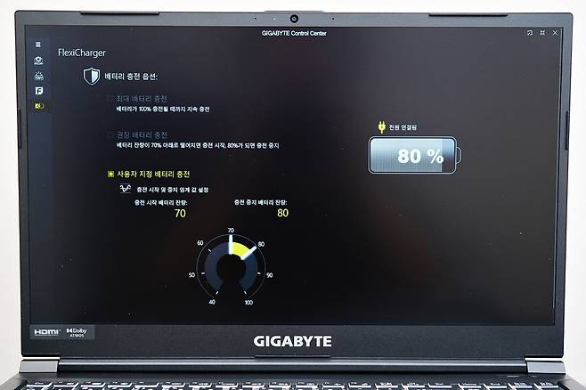 배터리는 54Wh배터리로 최대 4.5시간 무선사용이 가능하며 기가바이트의 전용 소프트웨어인 "GIGABYTE Control Center"를 통해 배터리를 오랫동안 사용할 수 있도록 충전 중지 배터리 잔량을 설정할 수 있습니다. 환경에 따라 100%까지 최대 충전도 변경이 가능하고 시작 및 중지 임계 값 설정이 가능하다는 점도 장점입니다.