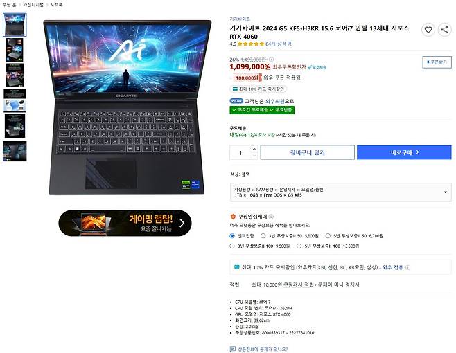 여기까지 기가바이트 G5 KF5에 대해 알아봤습니다. 가성비 게이밍 노트북으로 추천할 만한 제품으로, 고사양 게임까지도 플레이 가능하면서도 어디서든 휴대가 가능한 노트북을 찾는다면 좋은 선택이 될 수 있습니다. 현재 쿠팡로켓와우를 이용할 시 999,000원 할인 된 가격인 약 100만원 이하로 구매가능하며, 로켓배송도 가능해 주문 다음날 바로 받아볼 수 있다는 장점이 있습니다. 해당 가격은 다른 몰에서는 진행하지 않고 쿠팡에서만 행사를 진행하니 참고하셔서 합리적인 구매 해 보시길 바랍니다. 성능 대비 매우 합리적입니다. 해당 이벤트는 아래 링크를 통해 참여하실 수 있으니 선택 해 보시길 바랍니다.