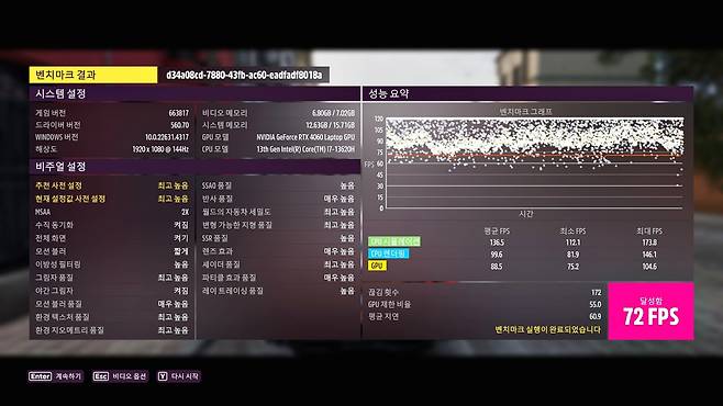 포르자 호라이즌5에서도 그래픽 옵션 최고 높음으로 벤치마크를 했을 때 평균 프레임이 72fps으로 측정이 되어 60fps 방어는 가능 한 성능이였습니다.