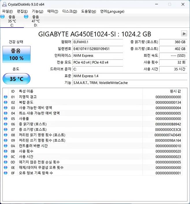 저장장치는 기가바이트 AG450E1024-SI라는 NVMe M.2 1TB SSD가 탑재되어 있습니다. PCIe 4.0 모델로 크리스타디스크마크 읽기속도 5,226.14MB/s, 쓰기속도 4,844.83MB/s로 측정이 되었습니다.