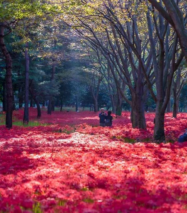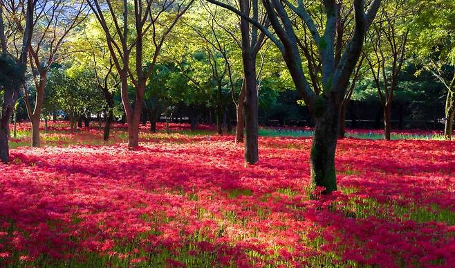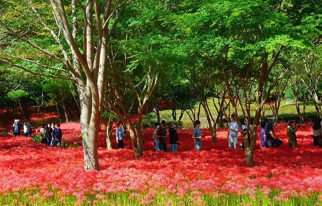 불갑산 일대는 국내 최대 규모의 상사화 군락지를 보유하고 있다. 9월이 되면 산자락을 따라 붉은 꽃이 물결처럼 이어져, 마치 대지를 붉은 융단으로 덮어놓은 듯한 장관을 선사한다.