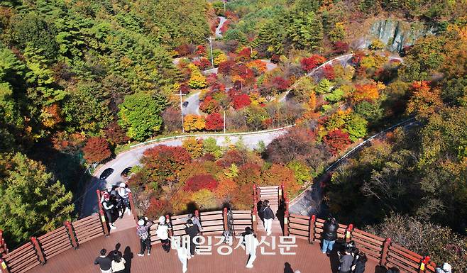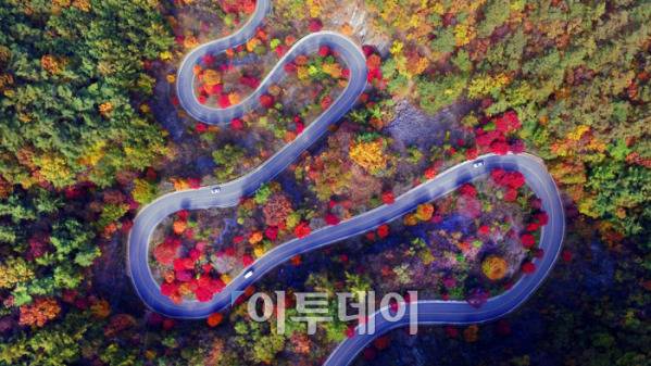 단풍이 하늘을 덮고, 산이 길을 품은 곳. 충북 단양의 보발재입니다.”