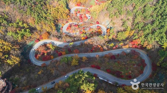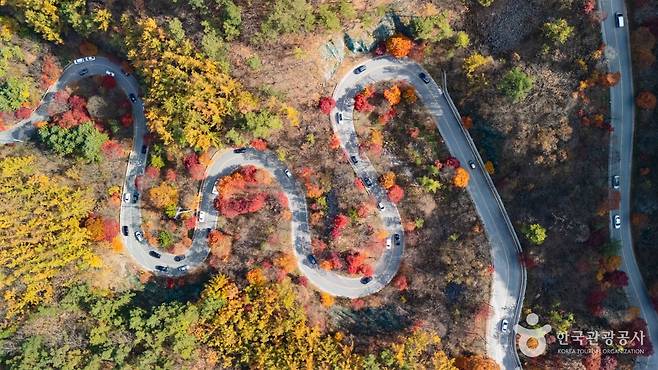 이곳은 해발 약 525m, 가파른 산 중턱을 따라 이어지는 굽이진 도로와 울창한 활엽수림이 특징입니다. 양쪽 산 능선이 맞닿아 만들어진 좁은 계곡 사이로단풍이 터널처럼 하늘을 덮으며 차량 위로 흩날립니다.