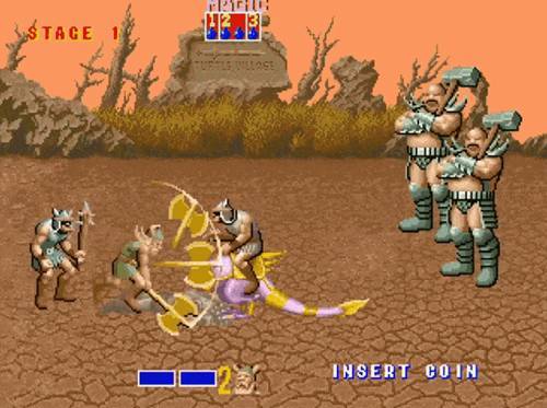 조기자 : 마법약을 주는 요정들, 그리고 탈 것, 죽을 때 몹들의 인상적인 비명소리 등 여러모로 시대를 개척한 실험적인 게임이 아닌가 생각해요. '수왕기'나 이 '황금도끼' 같은, 딱 이 시절의 액션 게임들을 참 좋아합니다. 그리고 여담이지만 사진에 보이는 대머리 형제의 웃음소리는 사람을 빡치게 하는 부분이 있죠; ㅎㅎ