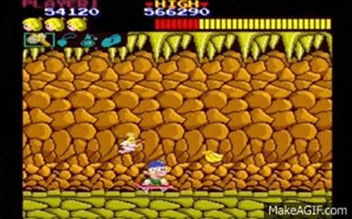 검떠 : 네 맞아요. 1986년도에 오락실용으로 출시된 원시인 액션 활극! 게임입니다. 돌도끼를 던지고 달팽이나 개구리 등을 해치우면서 앞으로 달려나가는 게임이죠. 쉽고 간단하지만 스테이지맵 밸런스를 잘 잡아서 일본 및 국내에서도 상당히 인기를 얻었죠. 틈틈이 과일을 먹으면서 체력을 보충하기도 하고, 스케이드보드를 타고 가기도 하고요.