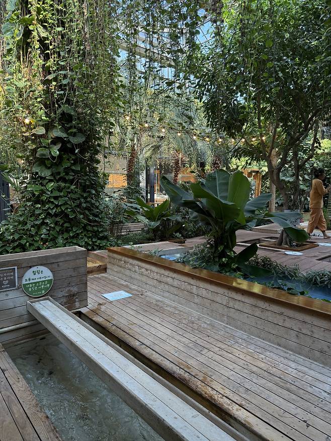 미리내힐링클럽에서 꼭 체험해야 할 것이 바로 숲속뷰 찜질과 족욕이에요. 각종 한약재가 들어간 듯한 향긋한 찜질방에서 몸을 노곤하게 풀어주다 보면, 노폐물도 함께 땀으로 배출되는 느낌이 들었어요. 족욕 코너에서는 따뜻한 물에 발을 담그고 숲 경치를 감상할 수 있어 더없이 여유로웠어요. 조용한 분위기에서 살짝 졸다가 밖을 보면 어느새 푸른 숲이 반겨주니, 이래서 ‘힐링클럽’이라는 이름이 붙었구나 싶었답니다.