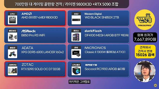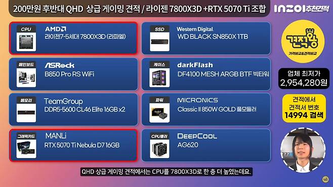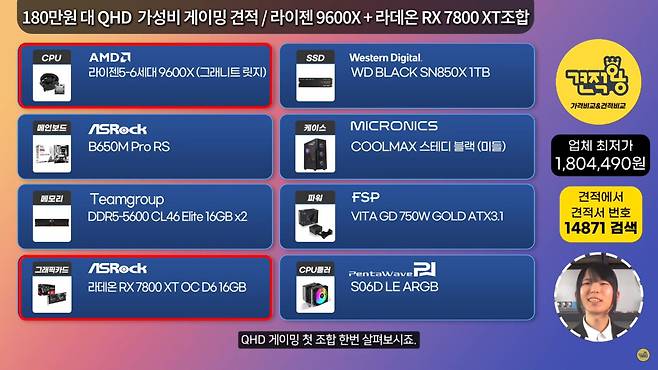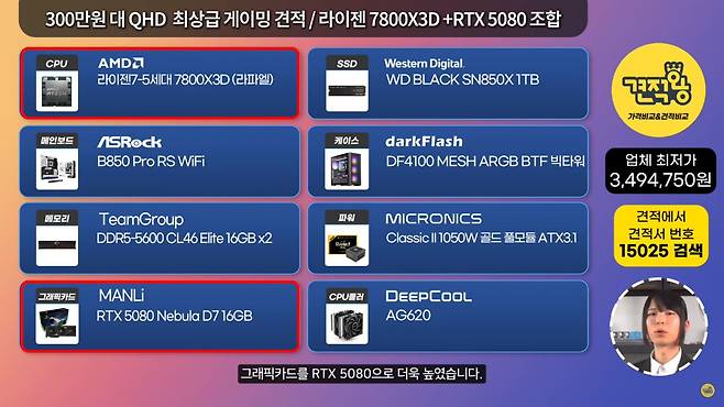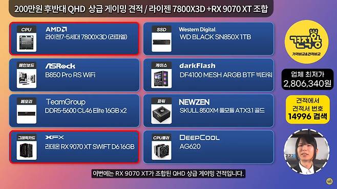 QHD 최상급 게이밍 견적의 경우 CPU는 7800X3D 그대로이고,