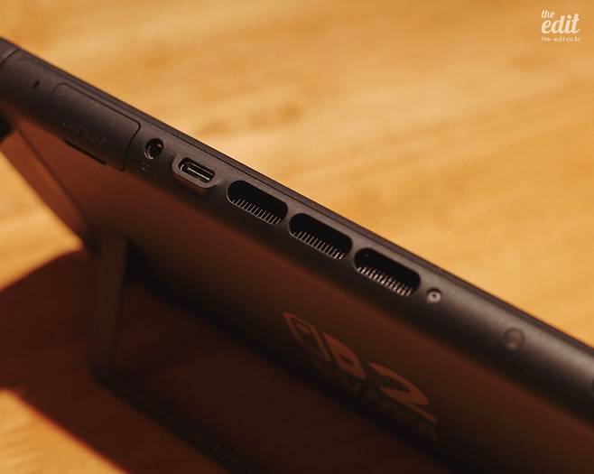상단에는 USB-C 포트가 추가되었는데, 테이블 탑 모드로 게임을 할 때 충전할 방법이 없었던 이전 세대의 문제에 대한 해결책입니다. 꼭 테이블 탑 모드가 아니더라도 일반적으로 충전하면서 게임을 하면 아래에 충전 케이블이 있는 게 거치적거릴 때가 많아서 위에 충전 단자가 하나 더 있는 건 아주 편리하다고 느꼈습니다.