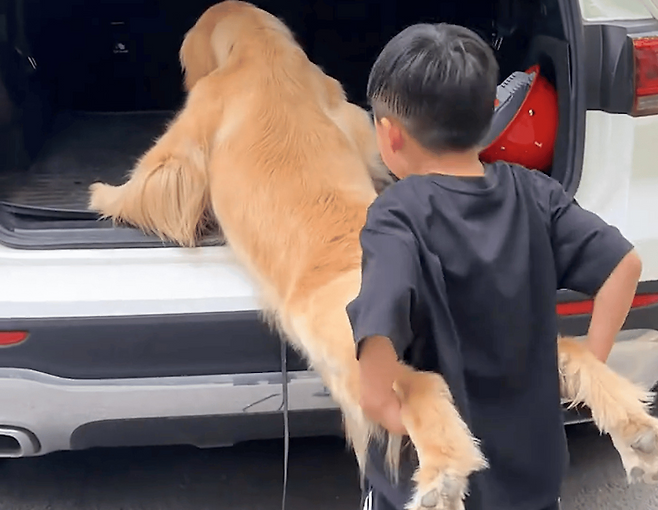 주인이 여유롭게 트렁크를 열자 공간이 꽤 넓었습니다. 골든 리트리버 강아지는 곧 시작될 여행을 눈치챈 듯, 앞발을 트렁크 가장자리에 올려놓고 "어서 저를 올려주세요, 출발하고 싶어요!"라고 말하는 듯한 모습이었습니다.
