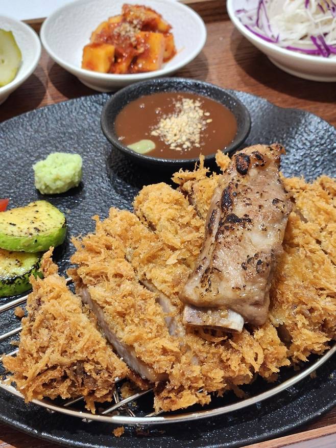 이곳의 대표 메뉴는 특제 양념에 갈비살을 숙성시킨 뒤 바삭하게 튀겨낸 갈비돈가스인데, 여기에 갈비뼈가 올라가 있는 모습이 눈길을 끈다.