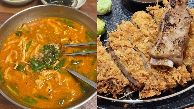 치즈돈가스는 안에 모짜렐라 치즈가 가득 들어 있어 한입 베어물면 치즈가 쭉 늘어난다. 식어도 치즈가 딱딱해지지 않아 끝까지 부드럽게 즐길 수 있다. 등심돈가스는 고기가 도톰하고 부드러워 씹는 맛이 풍부하다.