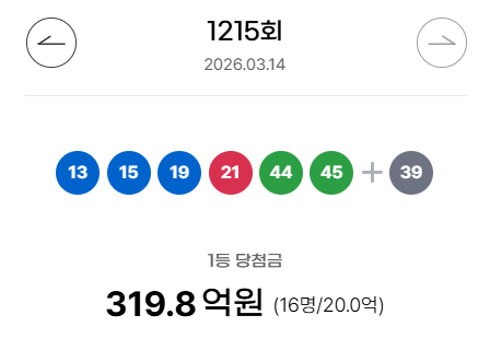 주말 밤이 되면 많은 분들이 제일 먼저 찾는 게 있습니다. 바로 이번 주 로또 당첨번호죠. 이번 로또 1215회 결과도 발표 직후 엄청난 관심을 끌었습니다. 1등 번호는 13, 15, 19, 21, 44, 45였고 보너스 번호는 39였습니다. 6개 번호를 모두 맞힌 1등은 16명으로, 각각 약 19억9854만원을 받게 됐습니다. 거의 20억원에 가까운 금액이라 이번 회차도 역시 뜨거운 화제가 됐습니다.
