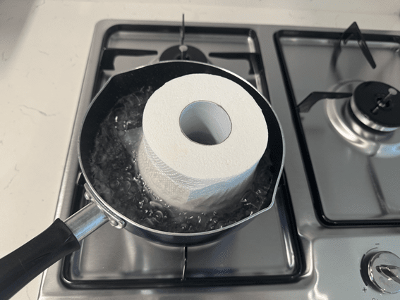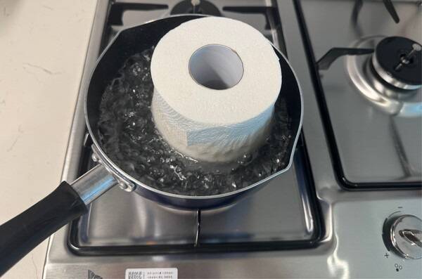 내열 용기에 두루마리 휴지를 넣고, 끓는 물을 천천히 부어줍니다.