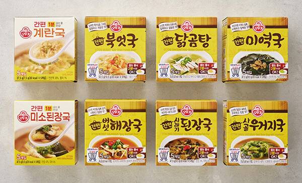 오뚜기는 번거로운 조리 과정 없이 즐길 수 있는 간편국 시리즈를 출시했다. ‘오뚜기 간편 블럭국’이 바로 그것으로, 건조블록 형태의 제품을 컵에 넣고 뜨거운 물을 부어 먹는 제품이다. 미소된장국, 시래기된장국, 미역국, 북엇국, 버섯해장국, 닭곰탕, 사골우거지국 등으로 구성됐다. 제품은 엄선된 재료를 급속 동결건조해 맛과 영양 손실을 최소화했으며, 조리 시 본래의 형태로 빠르게 복원돼 고유의 풍미를 즐길 수 있다. 개당 4천 원 내외의 판매가로 판매 중이다.