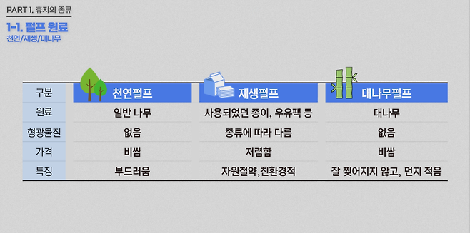 천연펄프, 재생펄프, 대나무펄프로 구분됩니다.