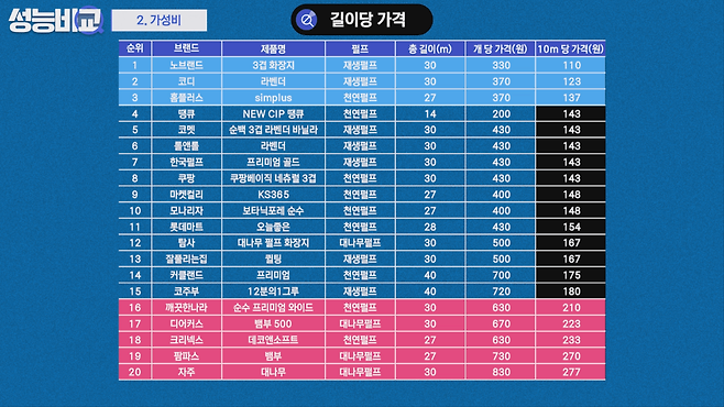 길이, 면적, 무게, 두께 등을 고려하여 가격을 비교해 보았습니다.