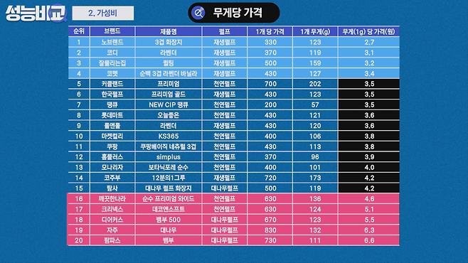 가성비 하위권에 있는 제품들이 대부분 대나무펄프 휴지였습니다.