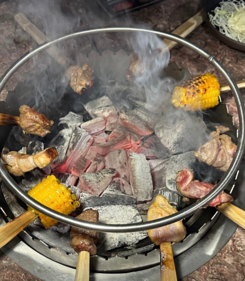 ▶ 캠핑 분위기의 참숯 화로, 직접 구워먹는 재미, 그리고 웰컴티까지 감성 포인트가 가득합니다.
